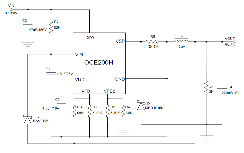 OCE200H是一款支持宽电压输入的开关降压型DC-DC,内置150V/100mΩ功率MOS,最高输入电压150V。输出电流可达3A以上同时支持输出恒压和输出恒流功能。